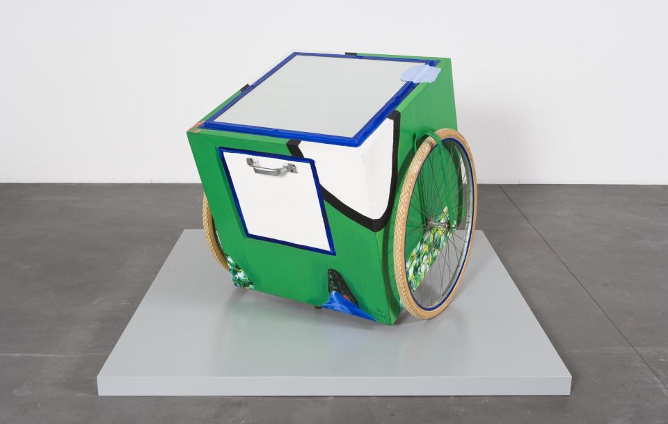 The handcart is a popular means of transport in the countryside where Raveel lives and works. He has one in his garden. He gives it a modern look by attaching bicycle wheels to it. At first, the cart appears in his drawings and paintings, but it later detaches itself from them. The cart is now an independent, three-dimensional object that can move freely in space and – purely hypothetically – can leave our exhibition halls.